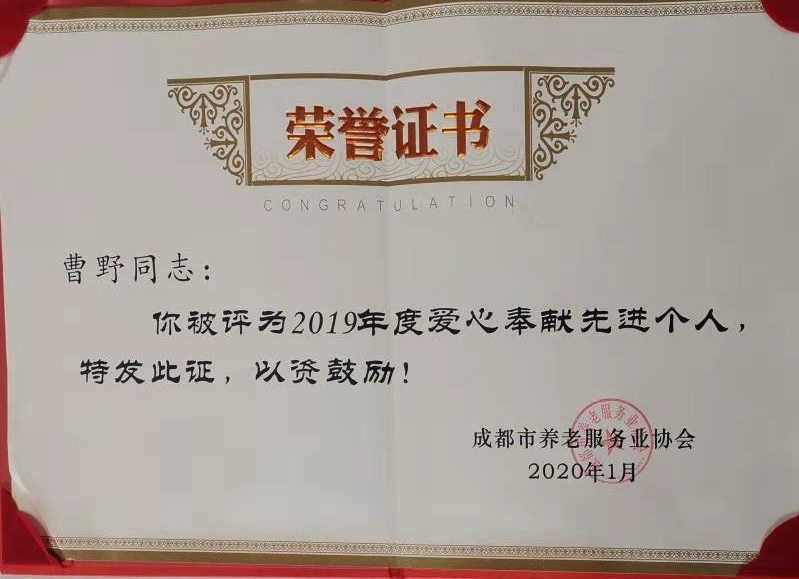 曹董事長(cháng)被成都市養老服務(wù)協(xié)會(huì )評為2019年度愛(ài)心奉獻先進(jìn)個(gè)人