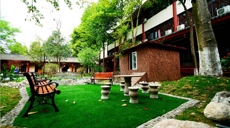 頤養中心建筑風(fēng)格為川西古典民居,雅梁畫(huà)棟,庭院幽靜,花草怡人,設施設備完善,配套合理舒適。中心內外綠樹(shù)成蔭、鳥(niǎo)語(yǔ)花香,猶如天然養吧、世外桃源,是成都市主城區范圍內出類(lèi)拔萃的綜合性園林式的養生養老基地。