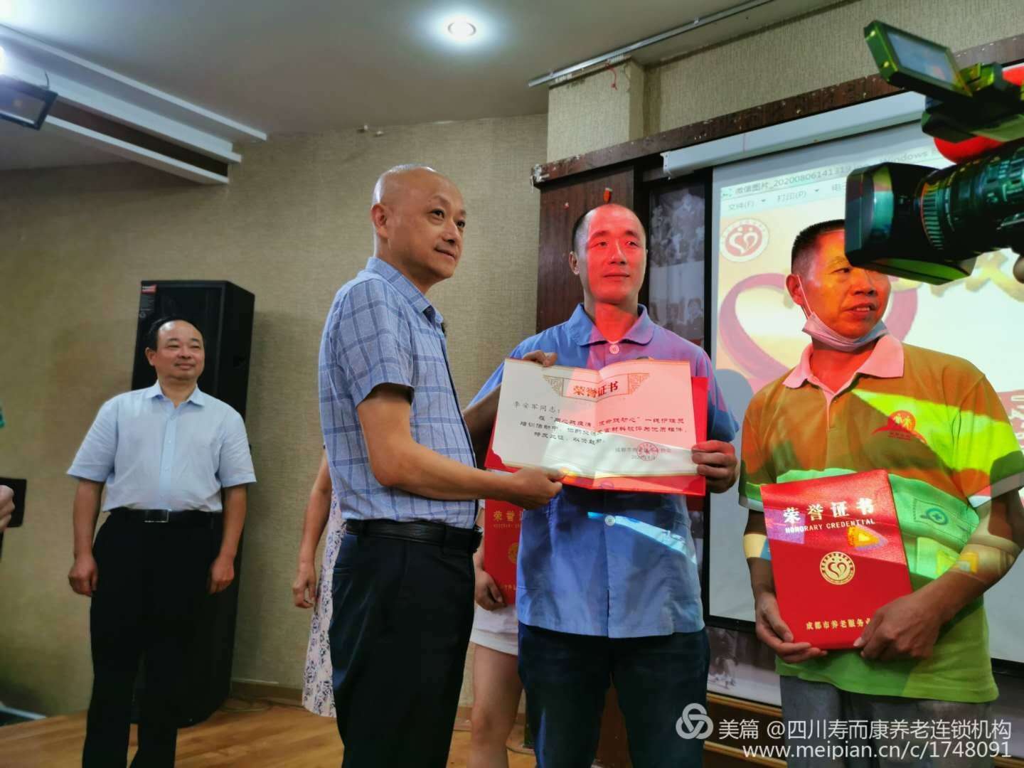 圖為:成都市成都市養老服務(wù)業(yè)協(xié)會(huì )副會(huì )長(cháng),四川壽而康養老連鎖機構董事長(cháng)曹野先生,親自為獲得“交流會(huì )優(yōu)質(zhì)發(fā)言”的李安軍頒發(fā)獎勵證書(shū)。