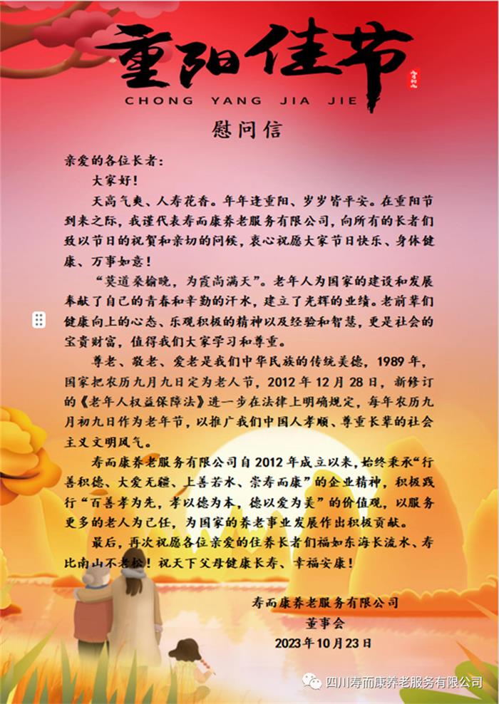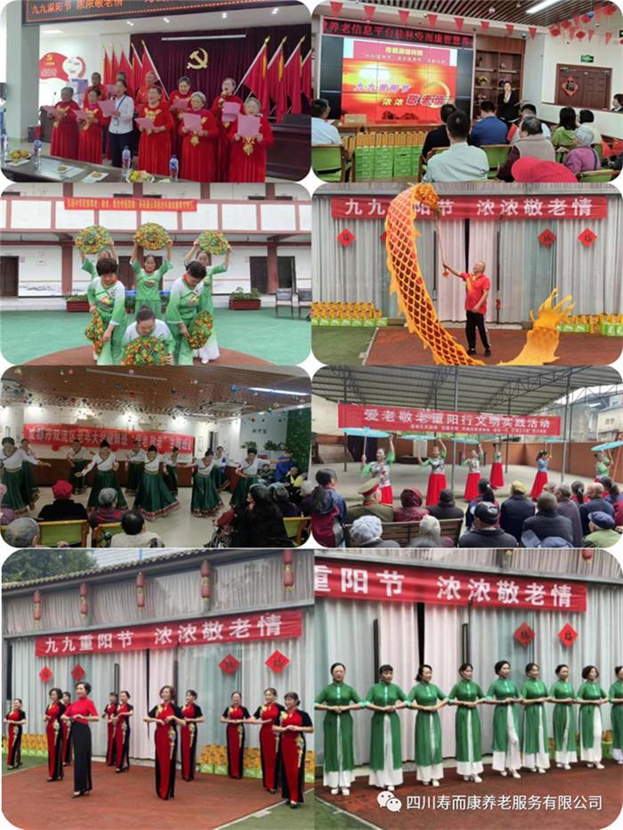 金秋天高氣爽,重陽(yáng)人壽花香。為響應國家“敬老月”活動(dòng)號召,進(jìn)一步弘揚中華民族孝親敬老傳統美德,營(yíng)造養老、孝老、敬老的良好社會(huì )氛圍。近日,按照壽而康養老服務(wù)有限公司董事會(huì )的統一部署,壽而康旗下成都片區、潼南片區、宜賓片區各養老院、敬老院,攜手當地民政部門(mén)和鎮街(社區),組織開(kāi)展了內容豐富、形式多樣的敬老主題系列活動(dòng),對老人進(jìn)行節日慰問(wèn),與老人共度重陽(yáng)佳節。